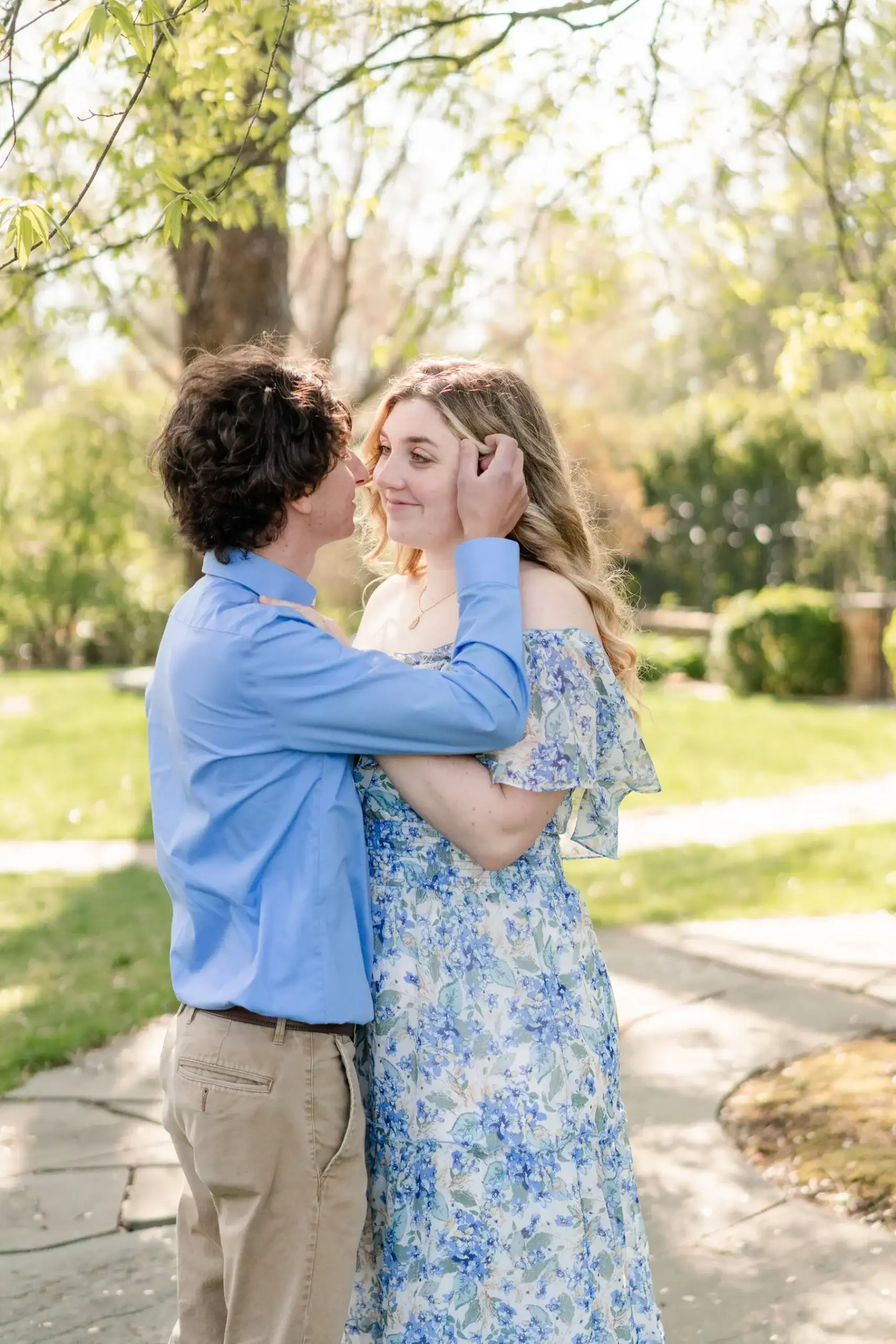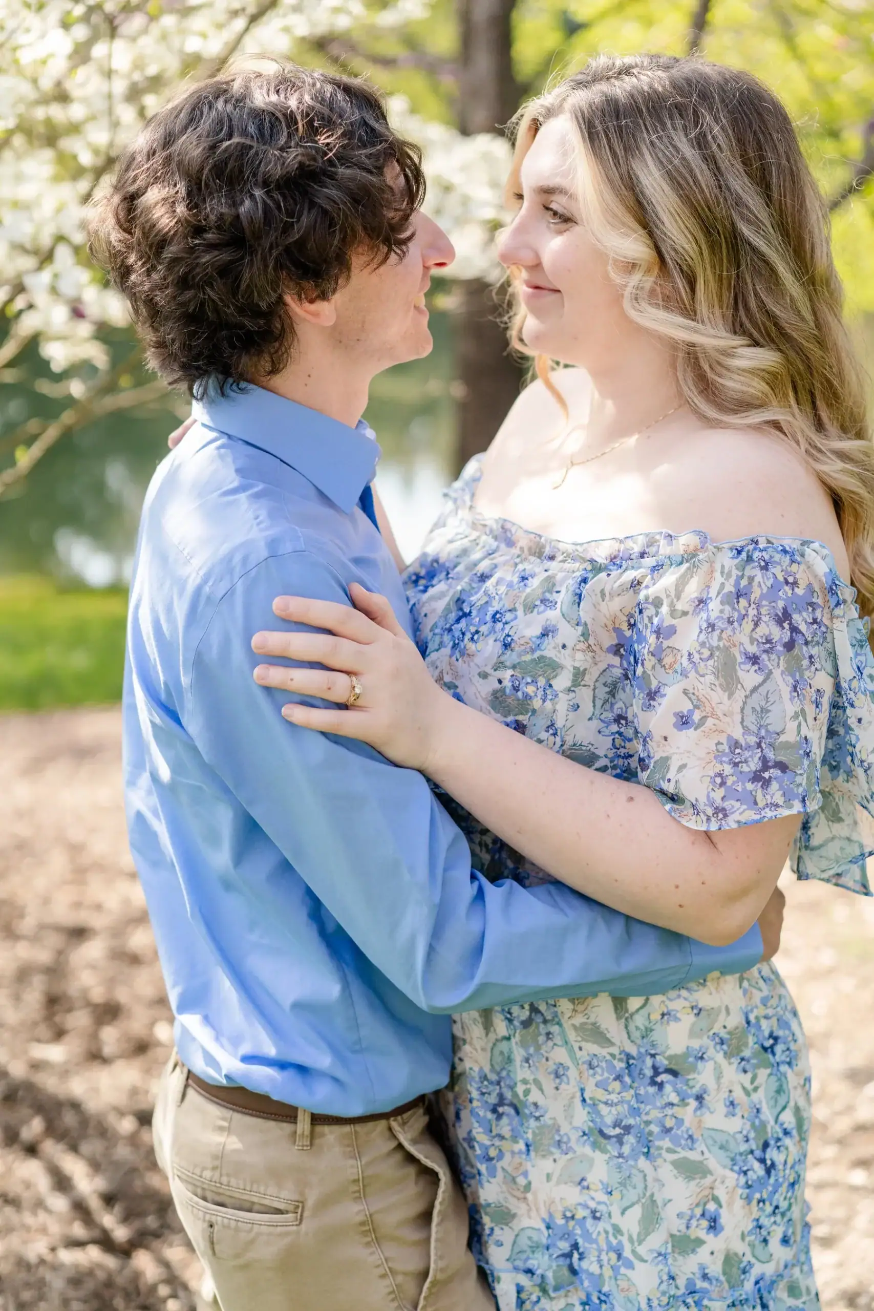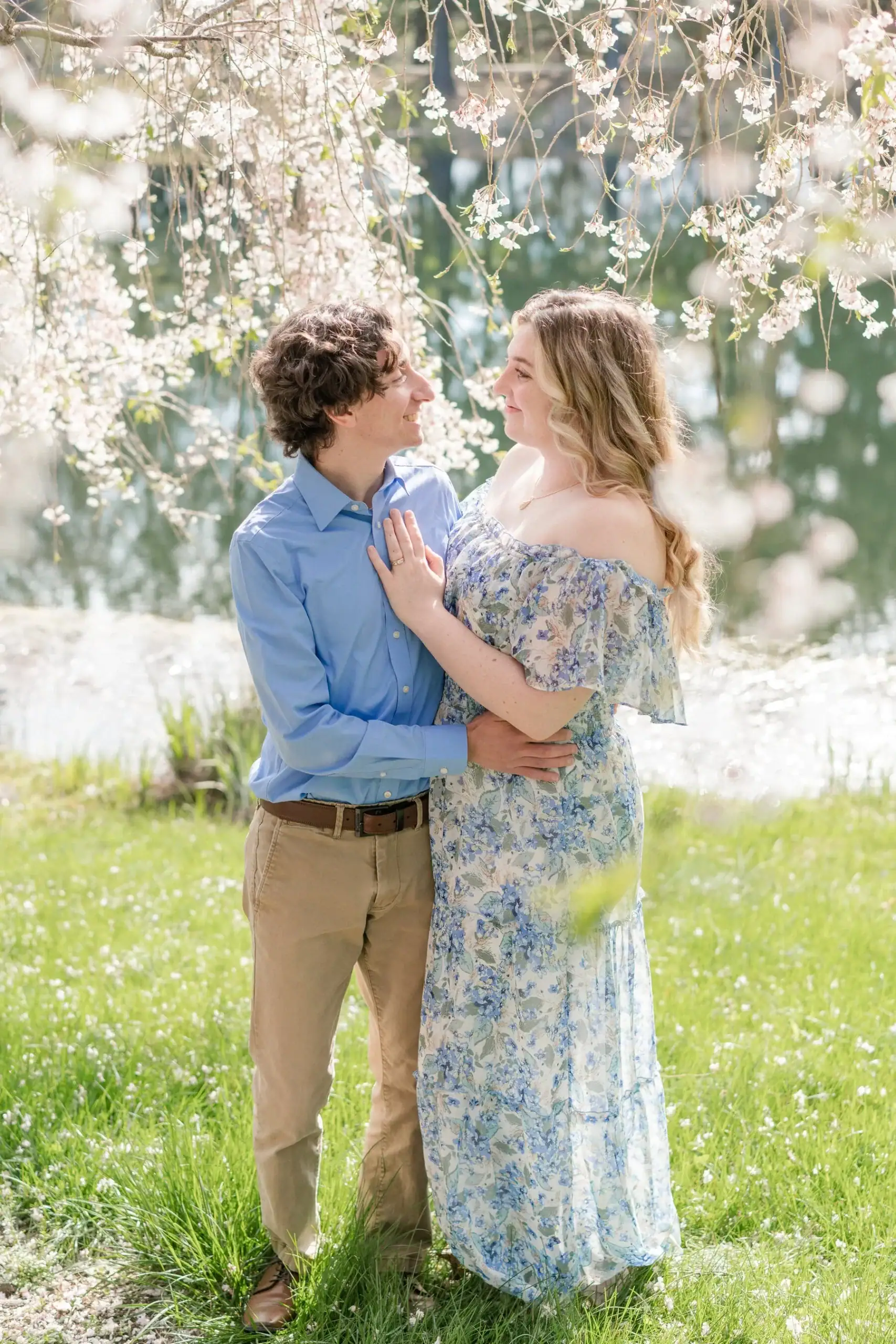 There’s something undeniably magical about photographing during those quiet morning hours when the world still feels soft and unhurried. For this Waterperry Farm engagement session, we embraced the mid-morning light — a time photographers often avoid — and were rewarded with the most luminous, dreamlike glow. We chose a garden location so that the engagement photos would tie back to the garden elements in the couple’s wedding design so seamlessly. The sunlight filtered through willow trees and danced across the water, creating a golden atmosphere that perfectly suited this sweet, romantic couple. Their connection felt effortless and tender, and the warmth of the day only added to the intimacy of their time together before heading back to their long-distance lives.