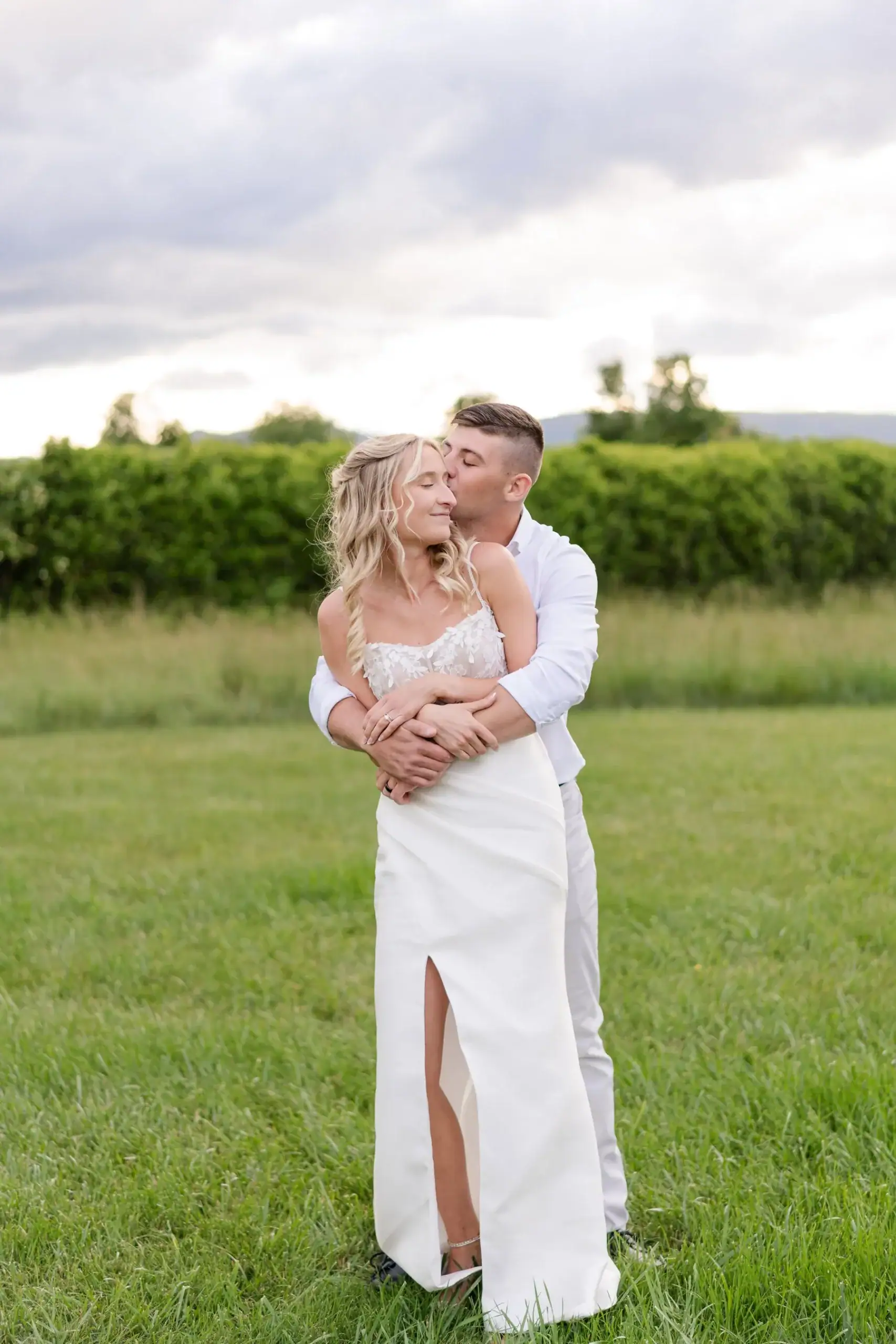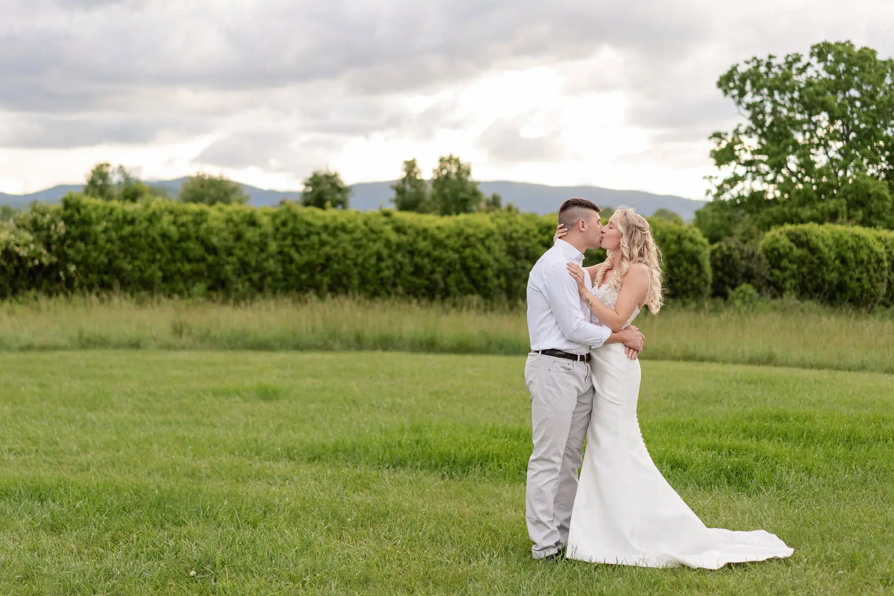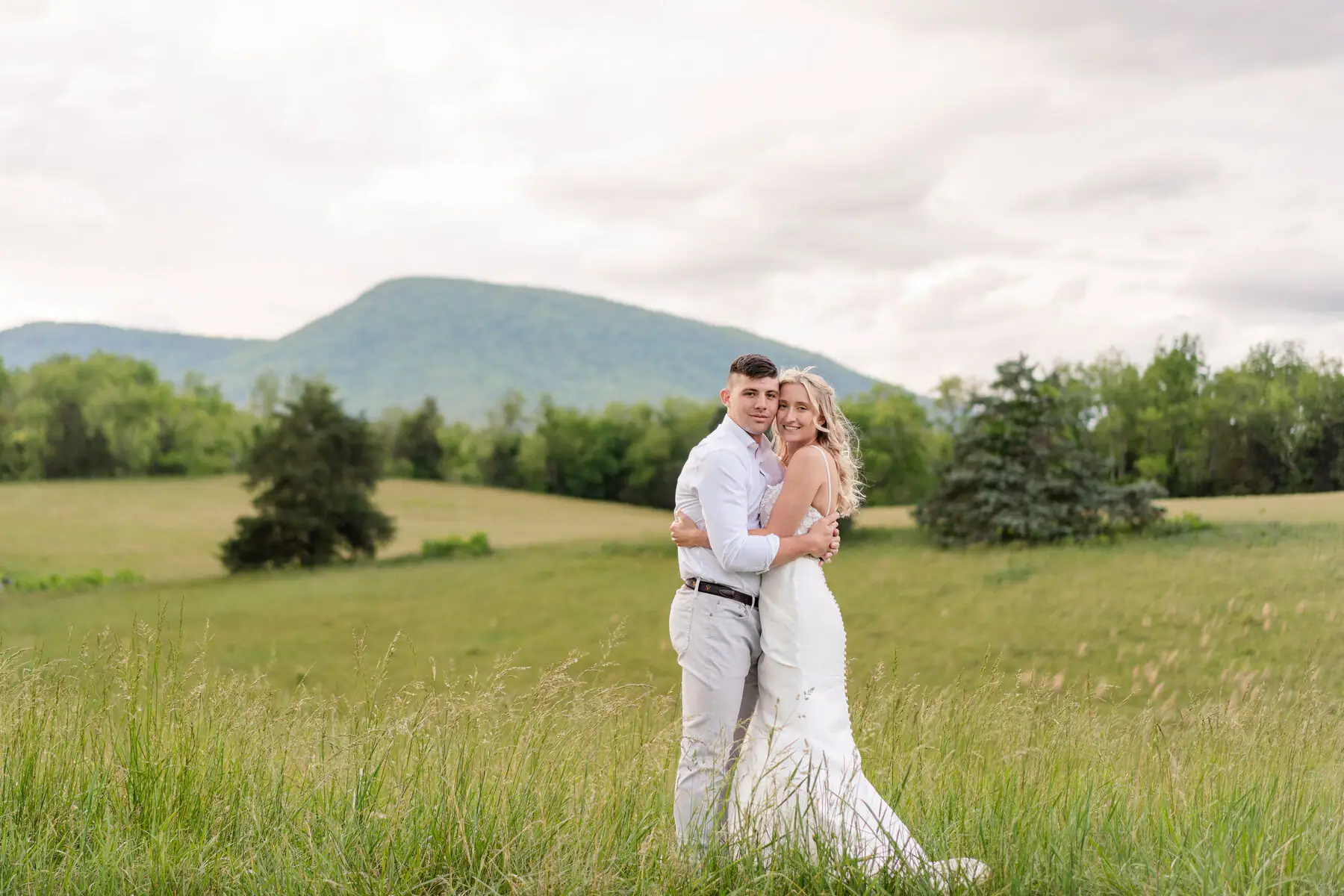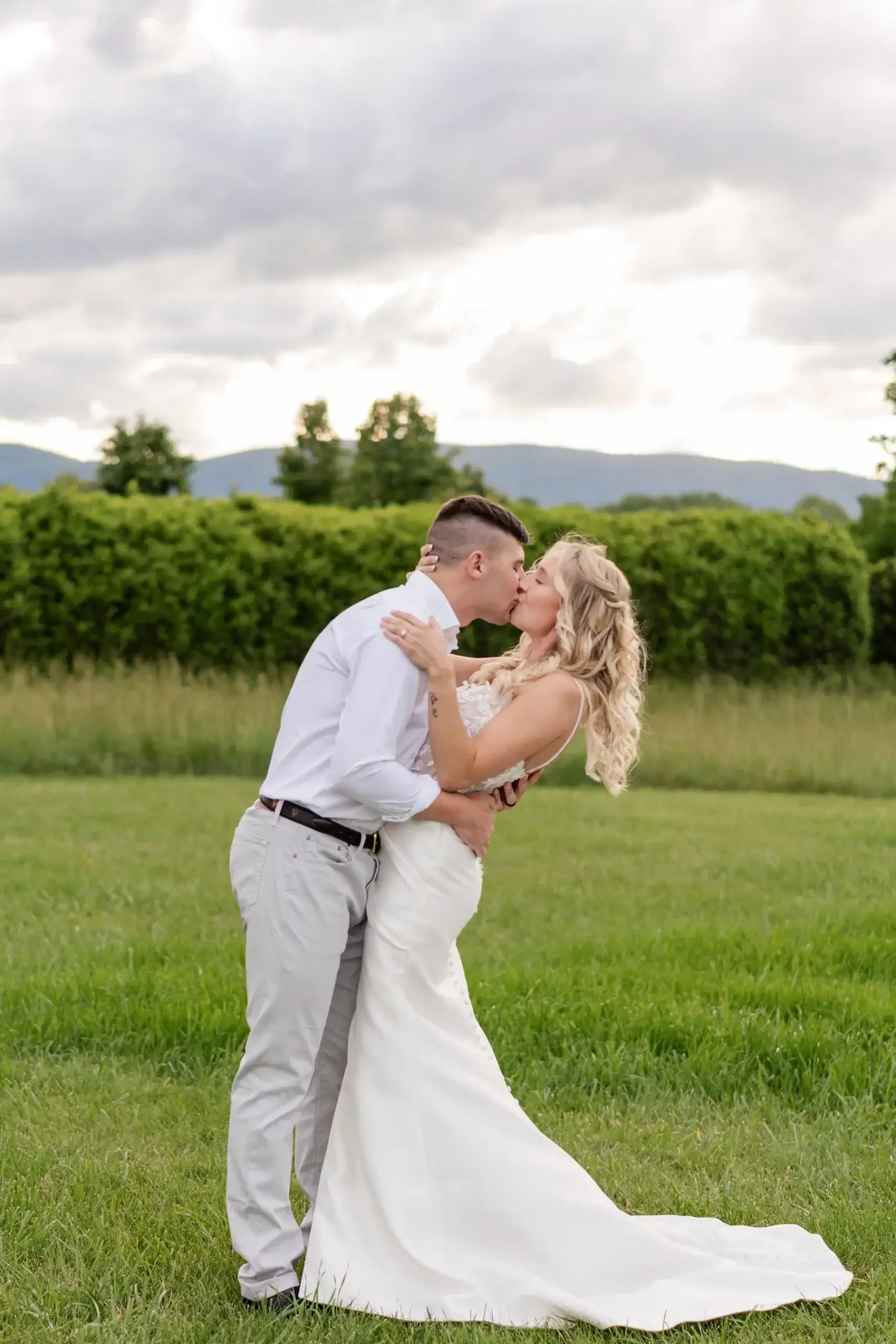The day unfolded in true Virginia spring fashion — a little bit of everything. After a cool, bright afternoon, light rain began to fall during dinner, creating the most magical surprise: a double rainbow arching over the lake. Guests stepped out to admire it, while laughter and clinking glasses echoed across the water. As the evening continued, the couple slipped away for a few quiet moments together on the hilltop, soaking in the golden-hour glow of a perfect sunset before rejoining their loved ones for a celebration that was equal parts elegant, relaxed, and full of heart.