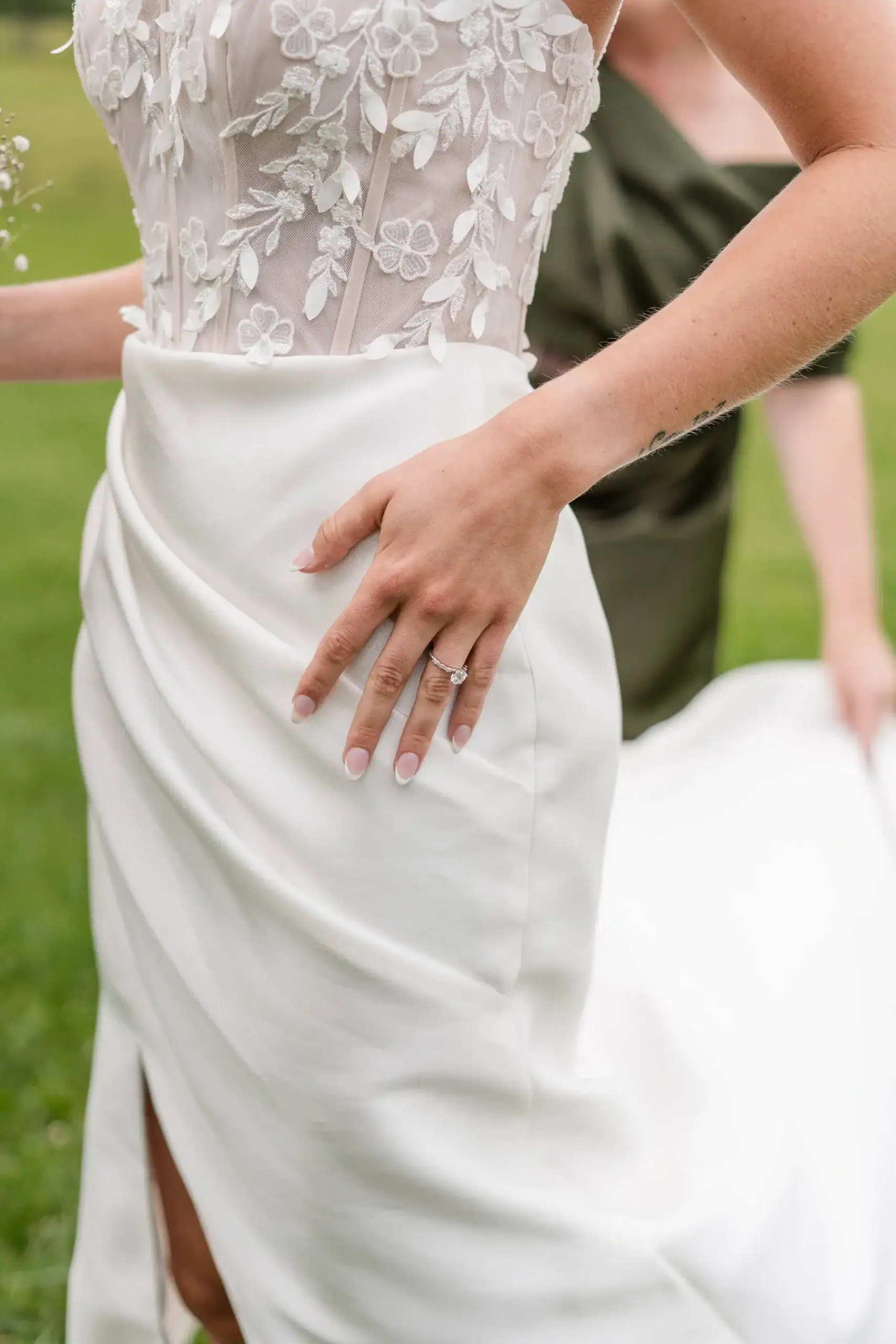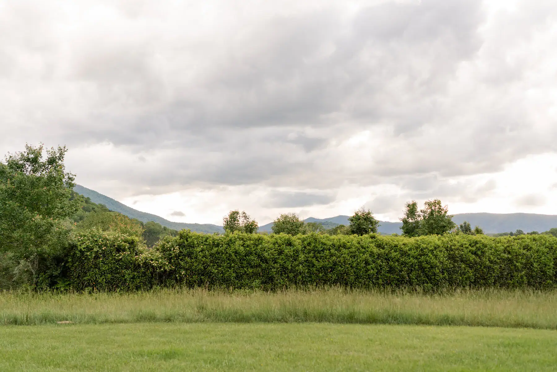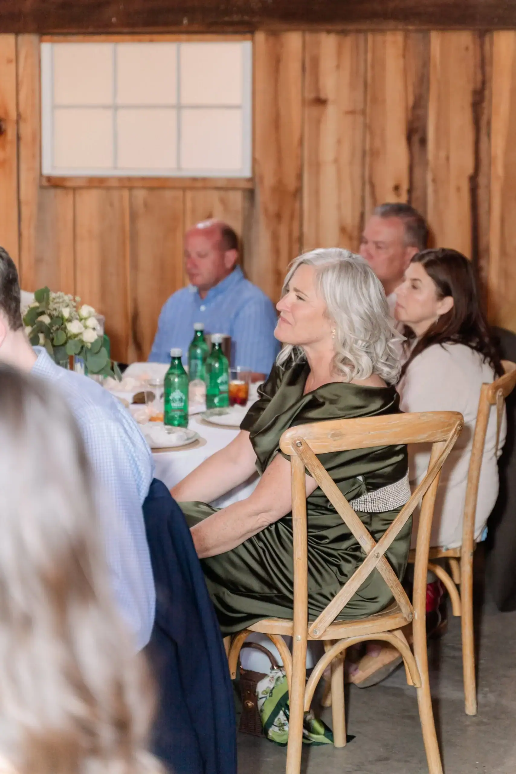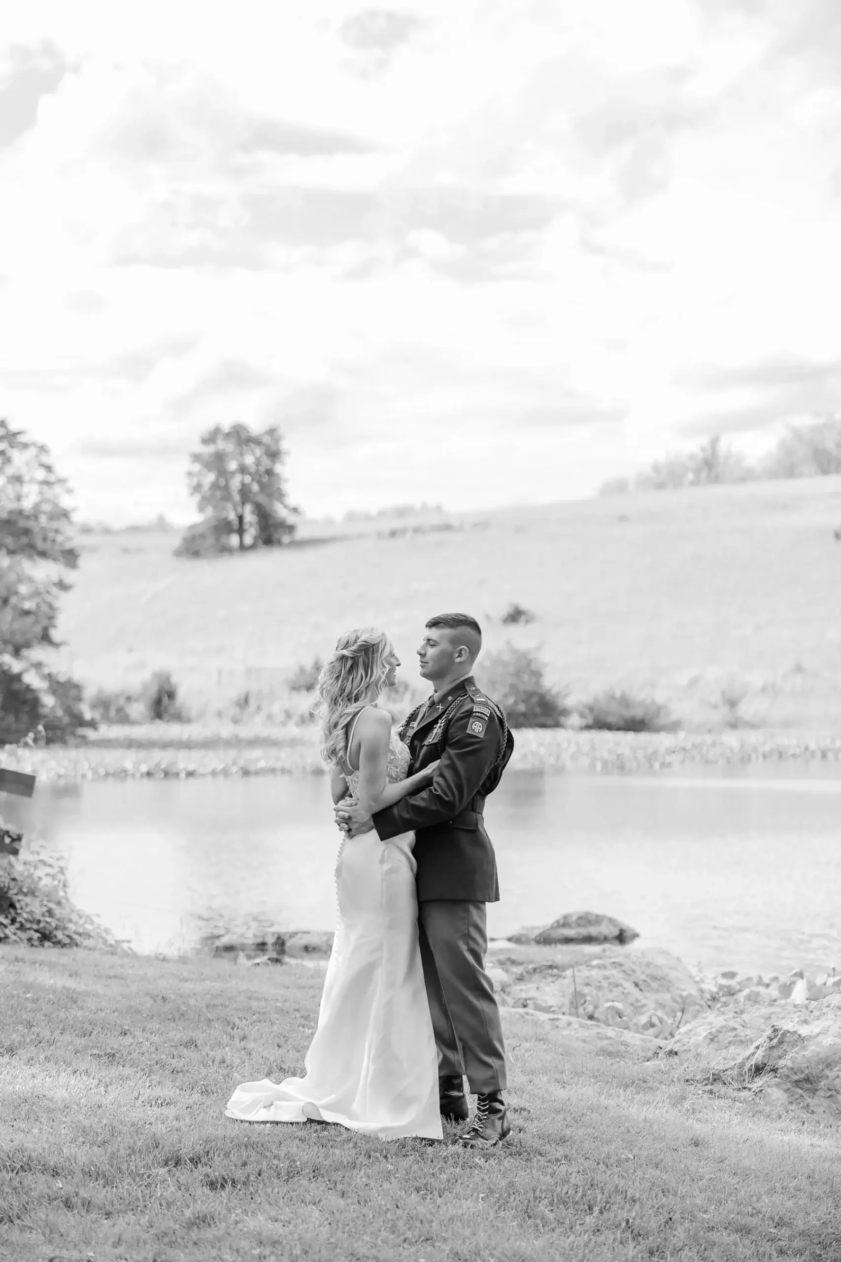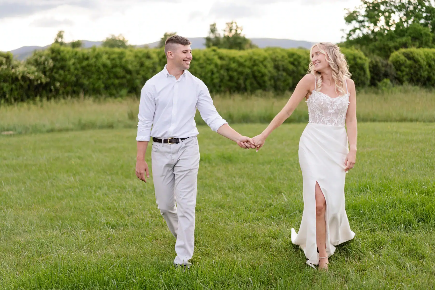 The day unfolded in true Virginia spring fashion — a little bit of everything. After a cool, bright afternoon, light rain began to fall during dinner, creating the most magical surprise: a double rainbow arching over the lake. Guests stepped out to admire it, while laughter and clinking glasses echoed across the water. As the evening continued, the couple slipped away for a few quiet moments together on the hilltop, soaking in the golden-hour glow of a perfect sunset before rejoining their loved ones for a celebration that was equal parts elegant, relaxed, and full of heart.