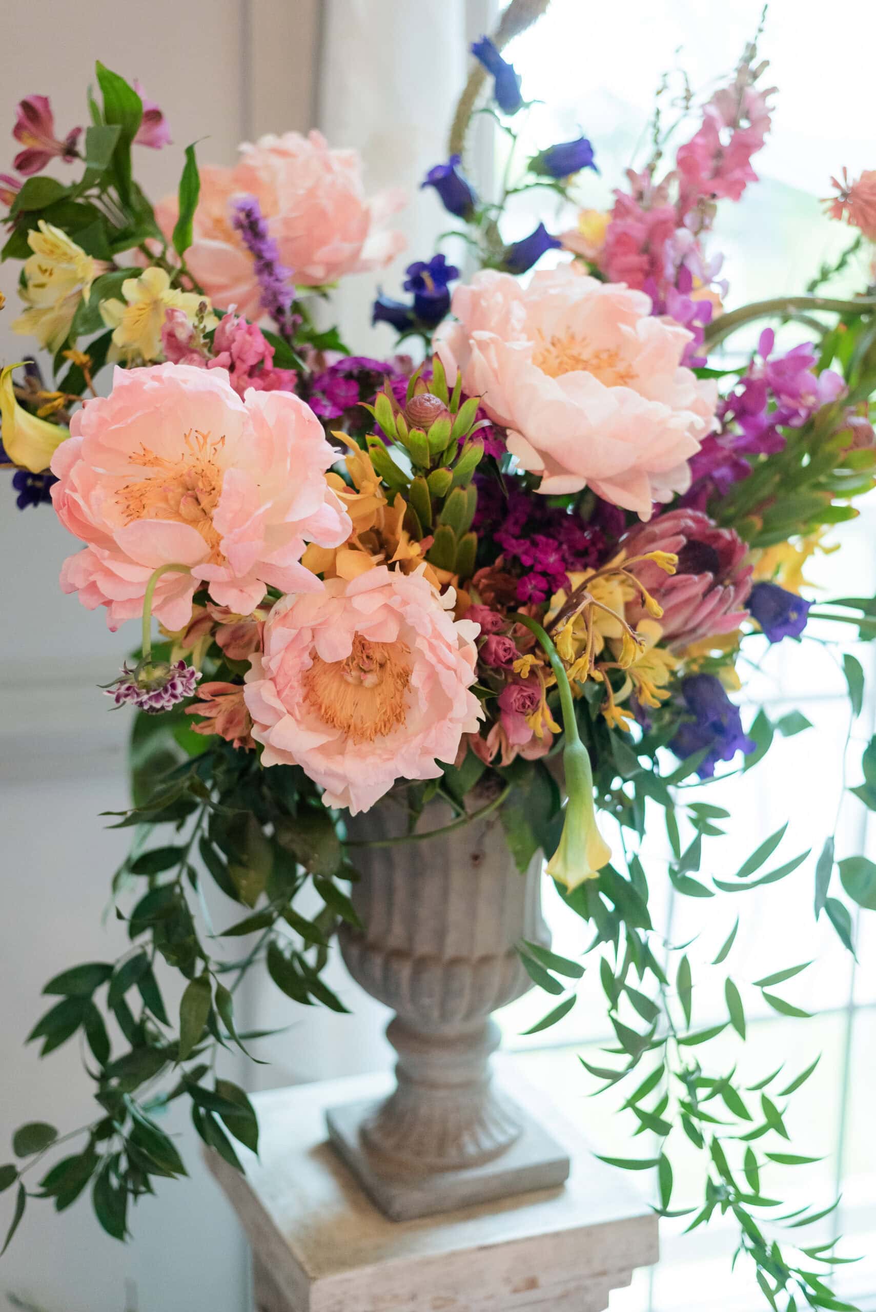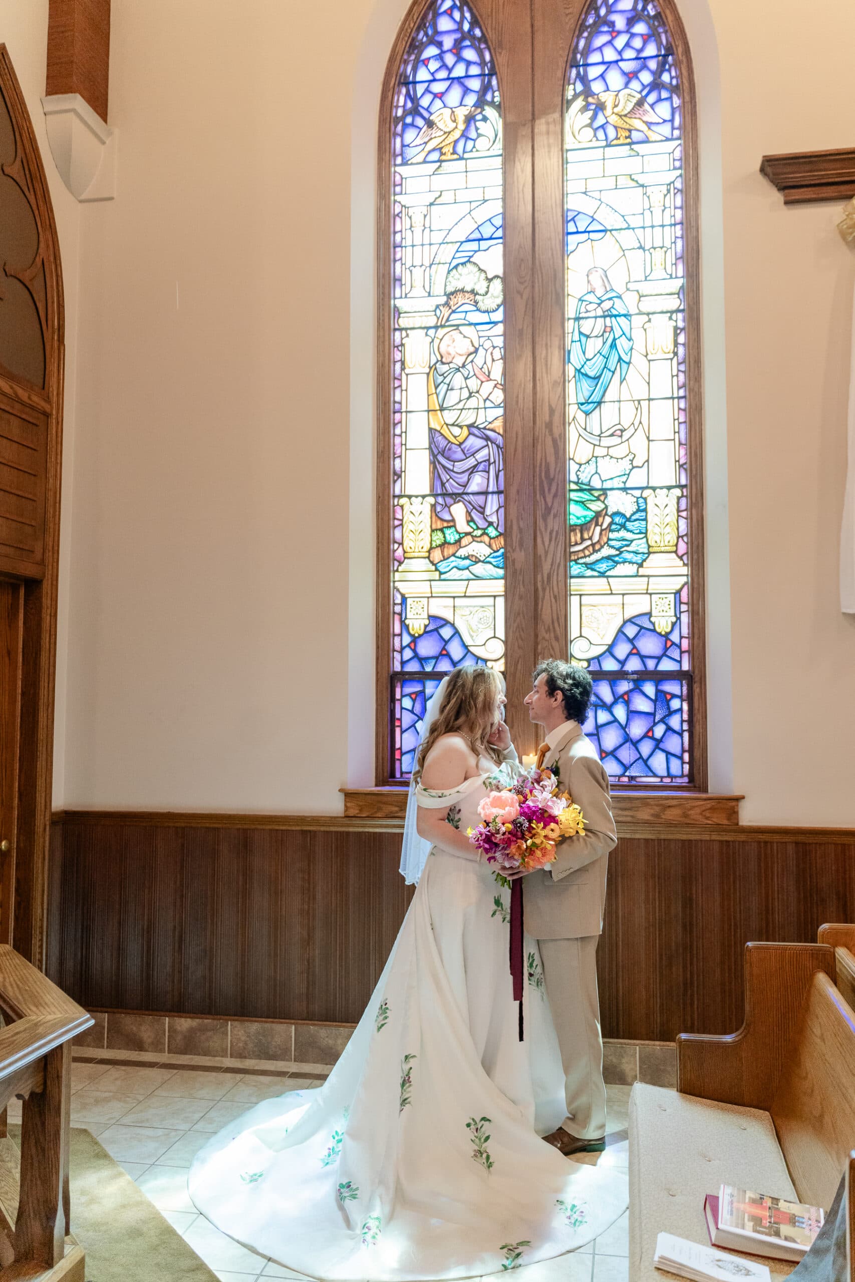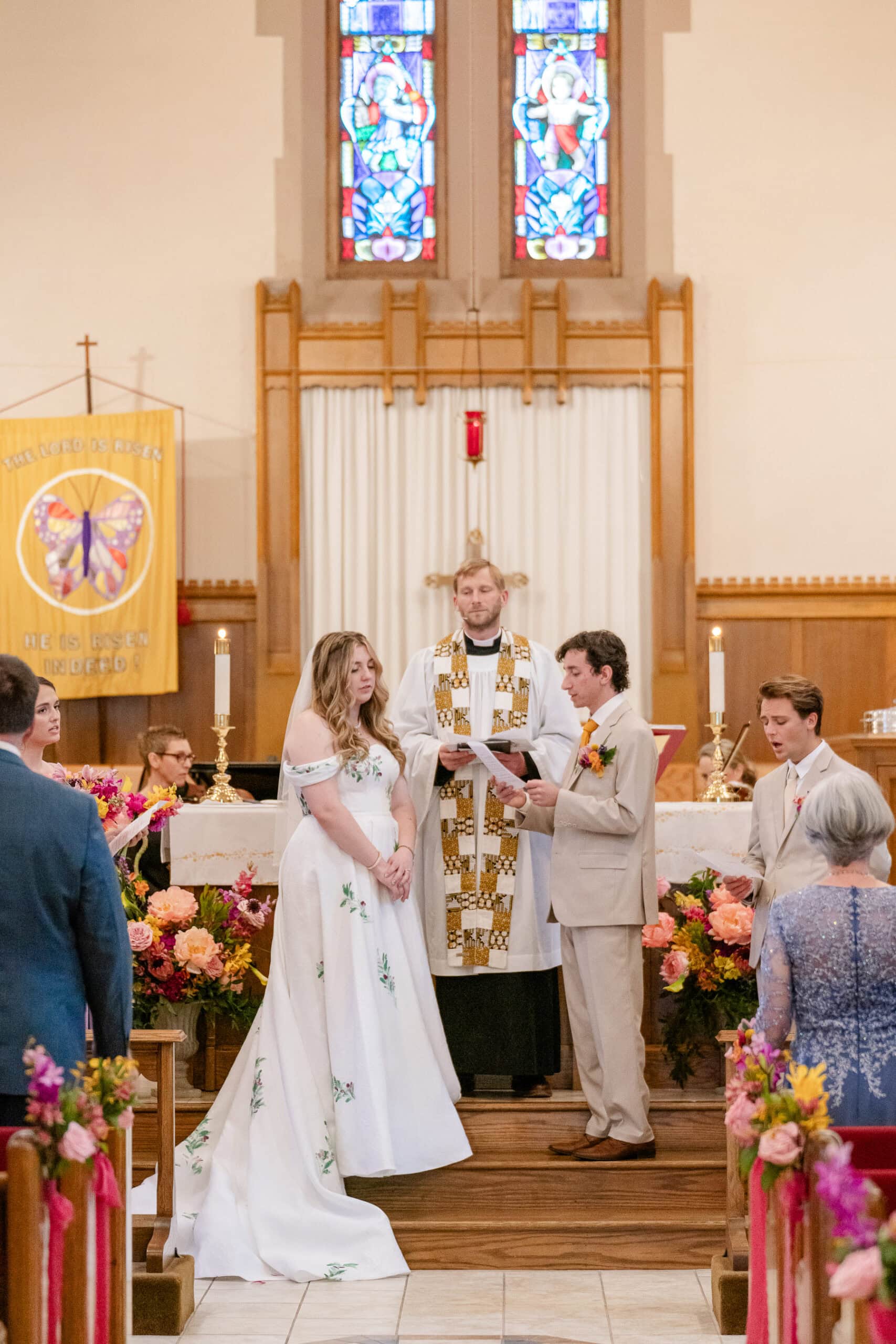 CJ and Gwen’s wedding in Harrisonburg, Virginia was full of charm, personality, and so many little details that made it truly unforgettable. They had a classic ceremony at the bride’s childhood church, which was extra meaningful. Their classic ceremony was followed by a high tea reception that felt like stepping into a magical garden, hosted by Spotswood Country Club. The reception was full of whimsy, from bug-inspired details sprinkled throughout to Gwen’s hand-painted gown and playful manicured nails. Each table was named after a bird, and the floral centerpieces matched the colors of the birds—bright, unique, and completely one-of-a-kind. Ket with One Last Avocado Floral Design created the standout floral arrangements, including the custom urns that framed the sweetheart table and the church altar, giving the whole day a fresh, garden-inspired feel.
