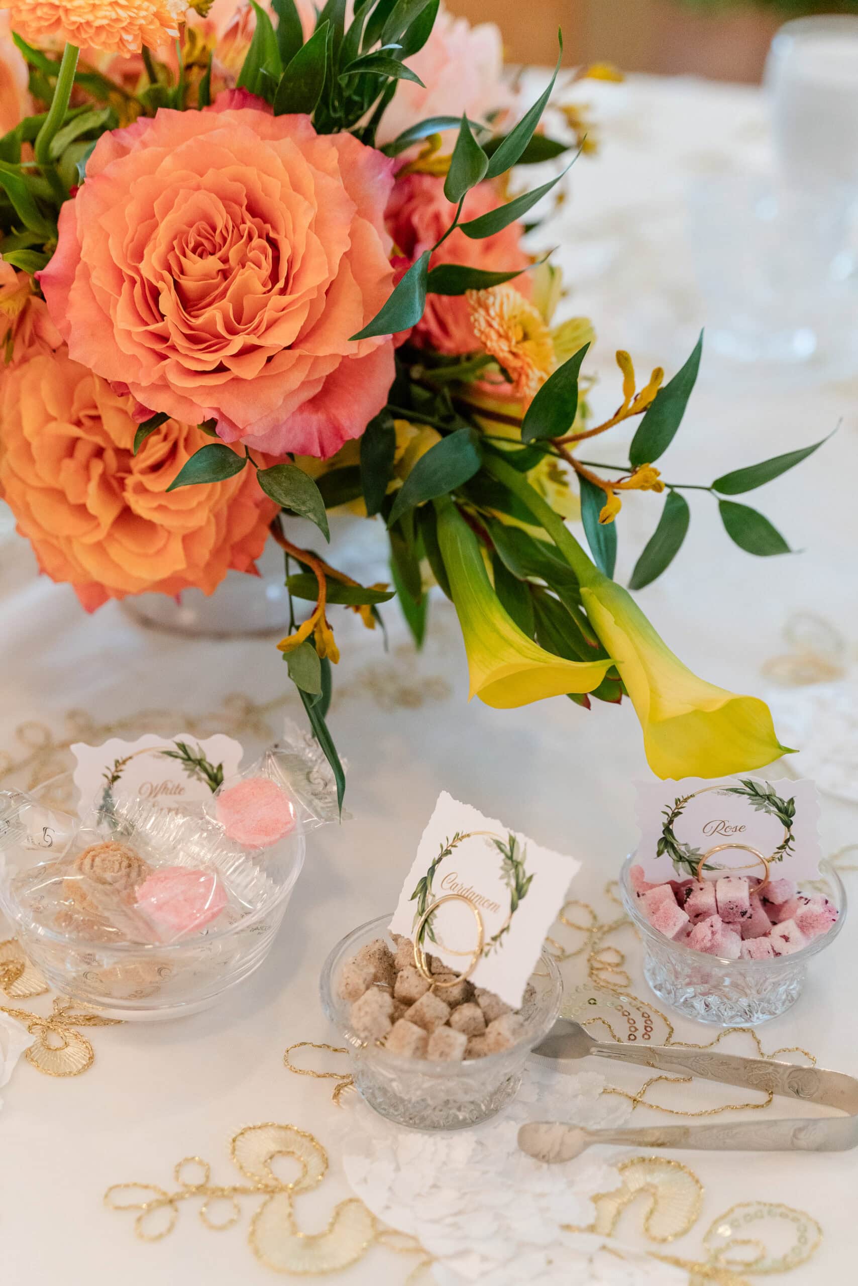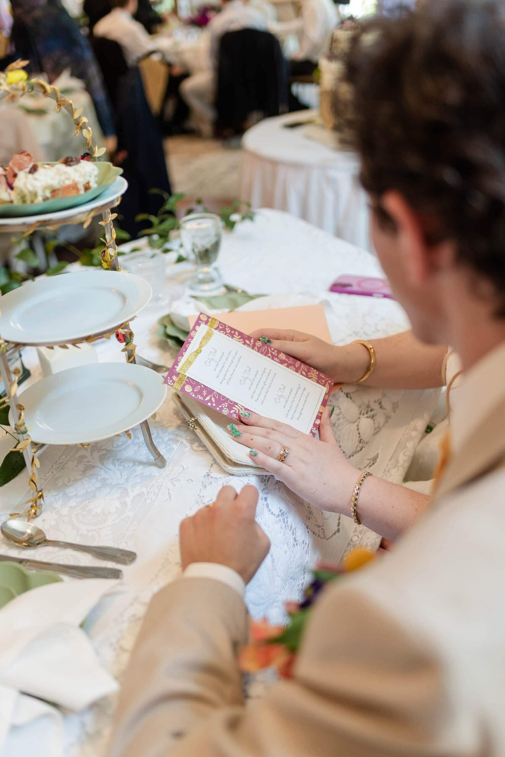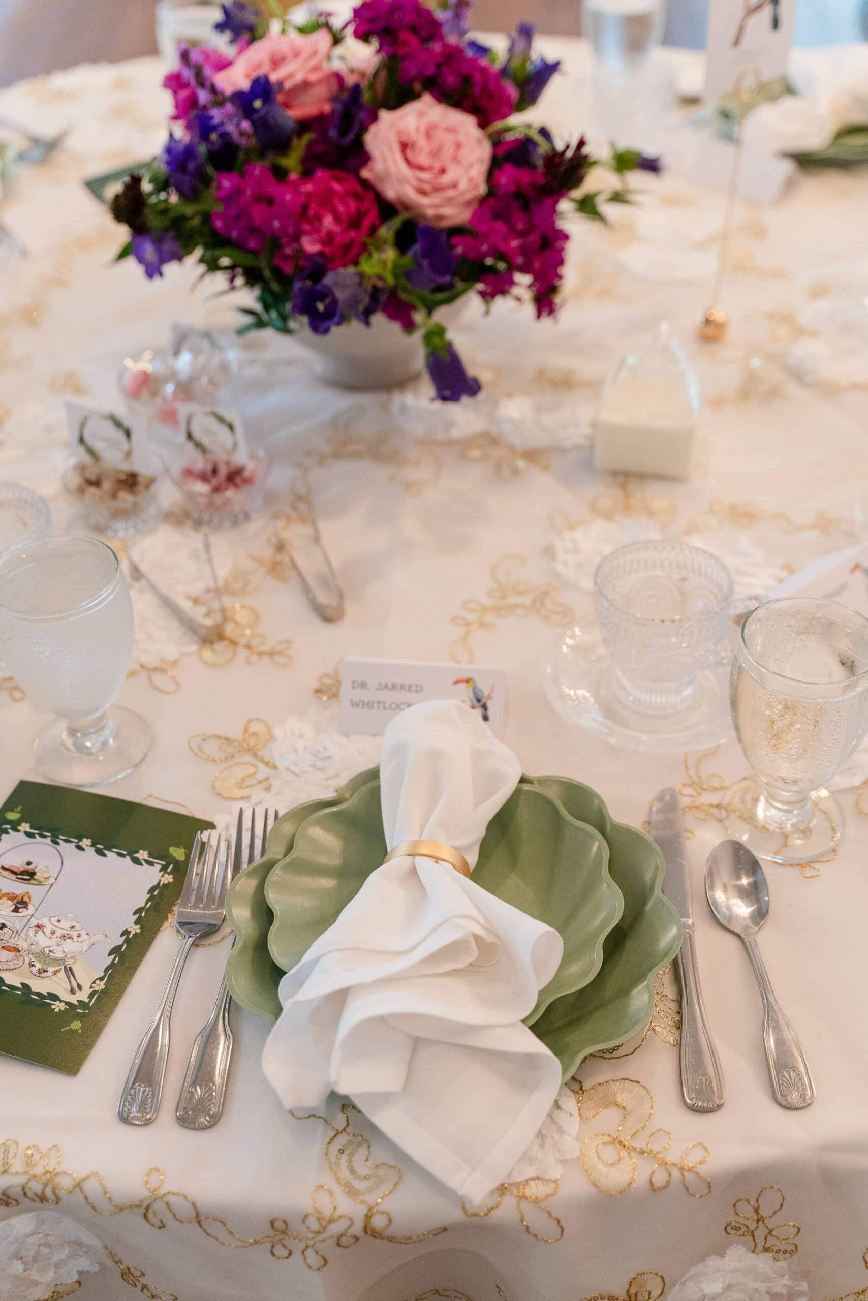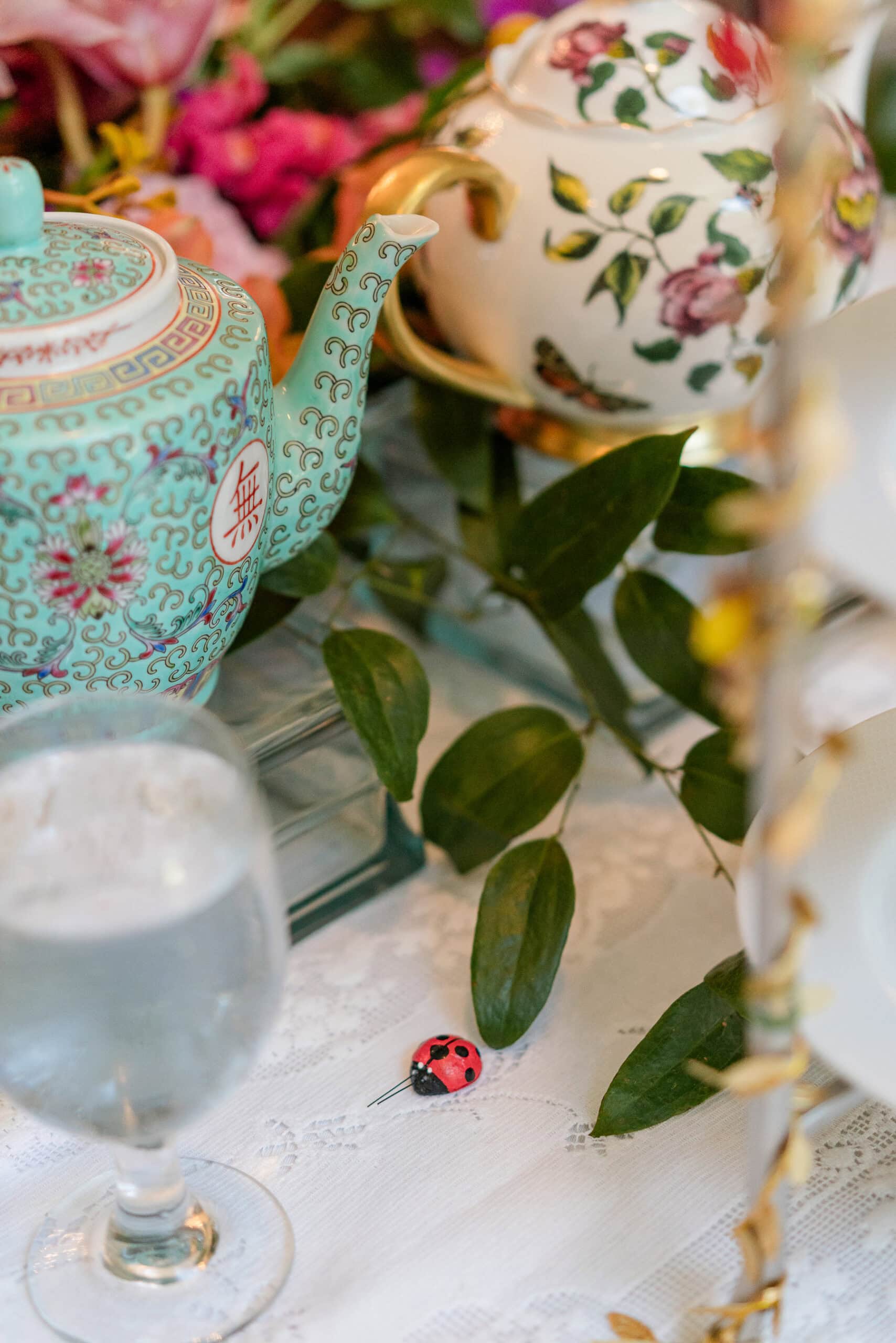 The couple’s personality really shone through in the little touches. The teapots for the high tea were all different—some inspired by bee hives, some Japanese-style, even a Winnie-the-Pooh teapot—making the tables feel fun and personal. CJ and Gwen also shared a private first look and exchanged vows just between the two of them, which was such a sweet, intimate moment amid all the playful details.